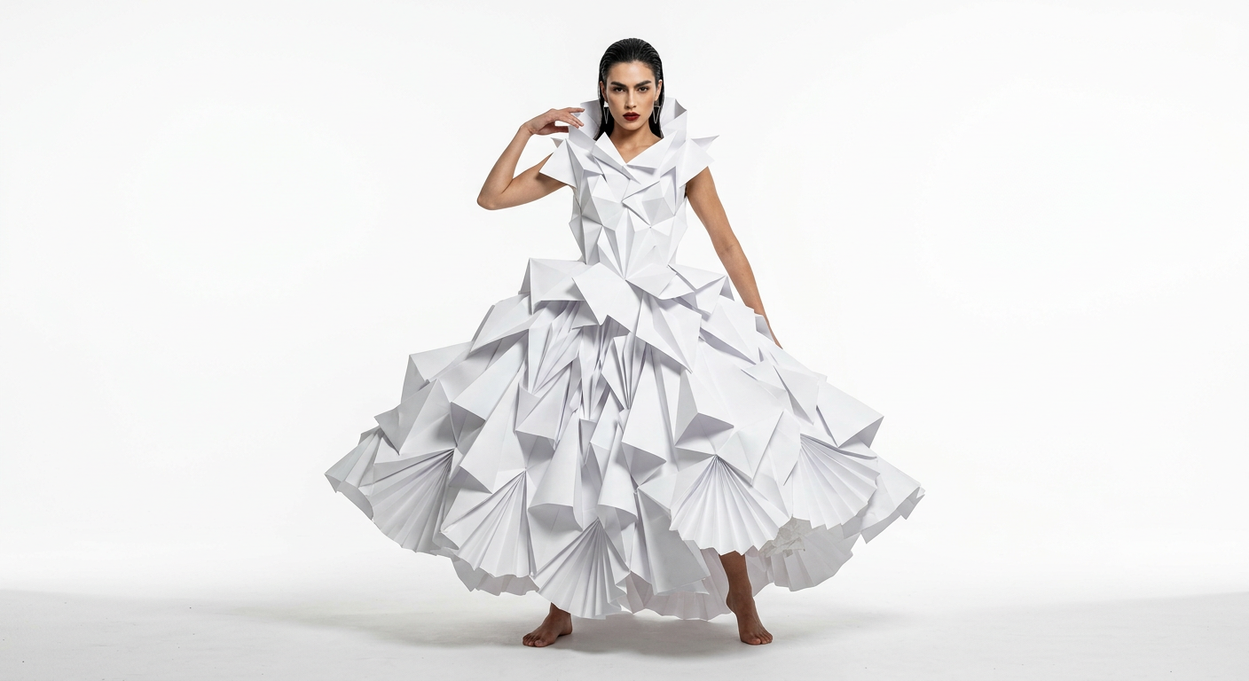 “Avant-garde fashion editorial with an architectural origami paper dress, stark white studio lighting”