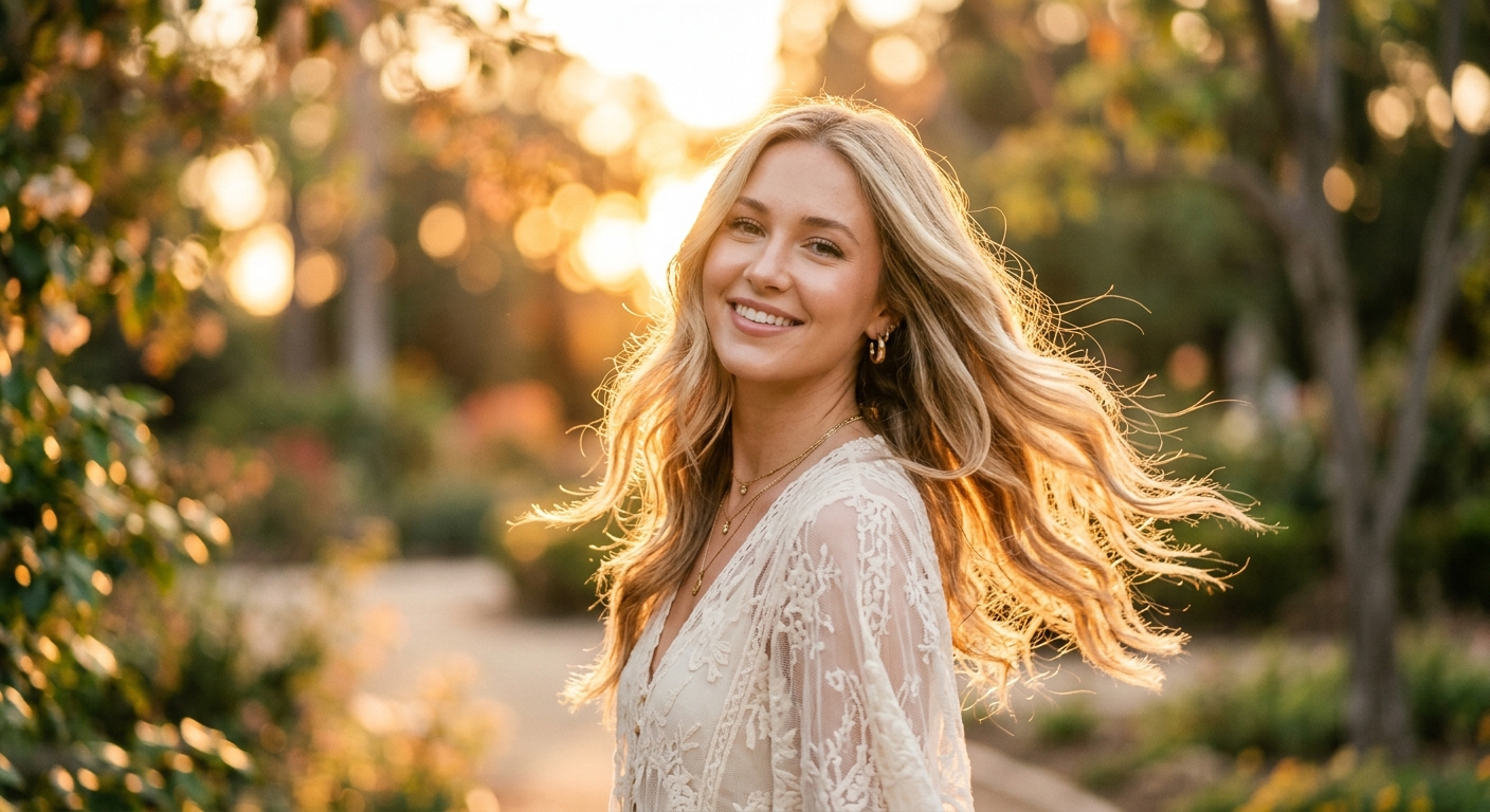 “Glamour portrait with golden hour backlighting and soft bokeh, flowing hair catching the light”