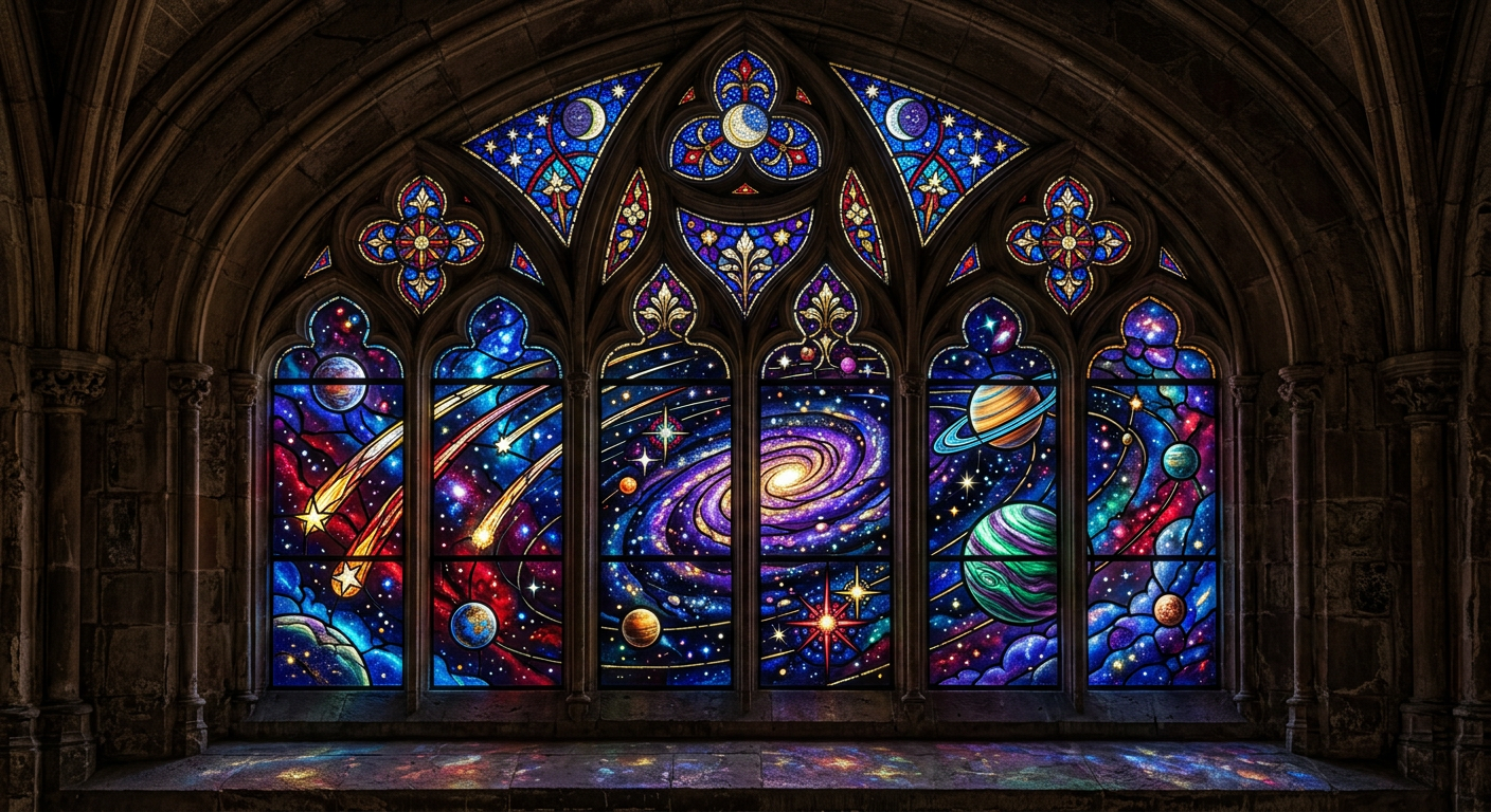 “Gothic stained glass window depicting a cosmic scene with planets, nebulae, and shooting stars in jewel tones”
