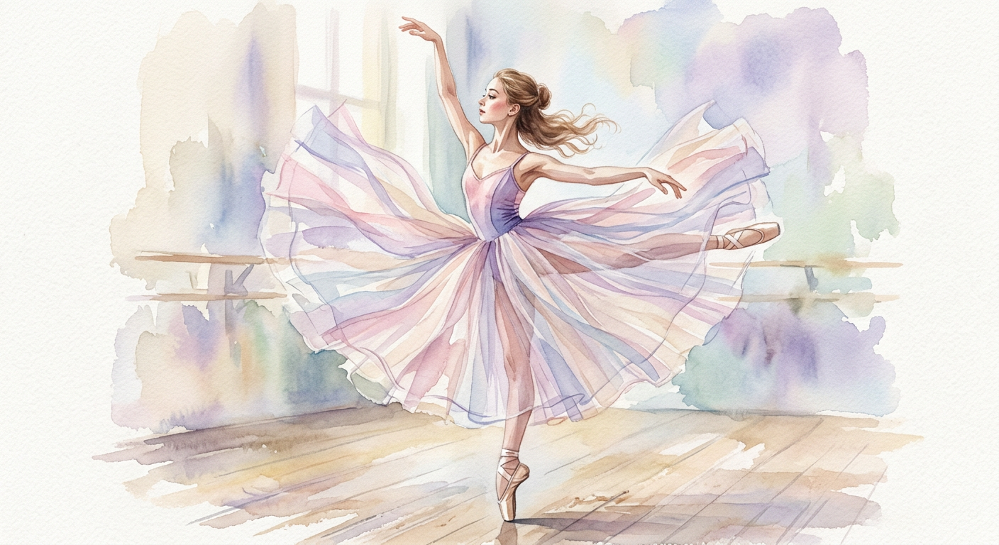 “Soft pastel watercolor portrait of a ballet dancer mid-twirl, flowing tulle fabric”