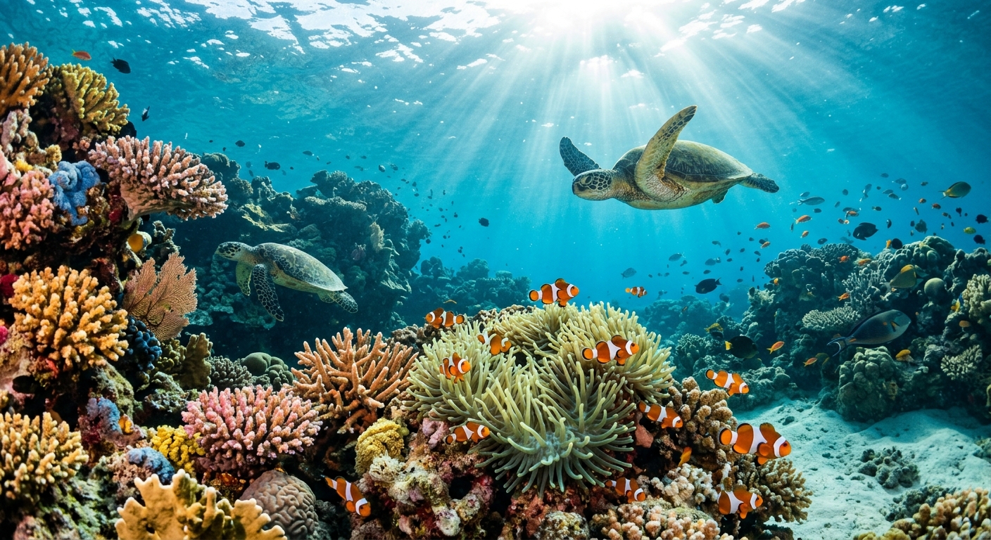 “Vibrant coral reef underwater scene with clownfish, sea turtles, and shafts of dappled sunlight from above”