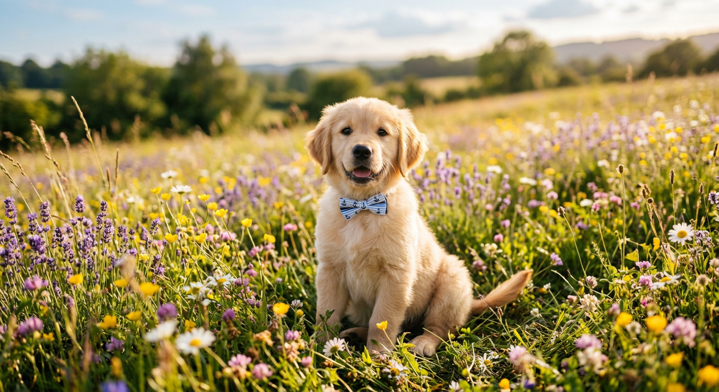 “Golden retriever puppy wearing a tiny bow tie, sitting in a sun-drenched field of wildflowers, soft focus background”