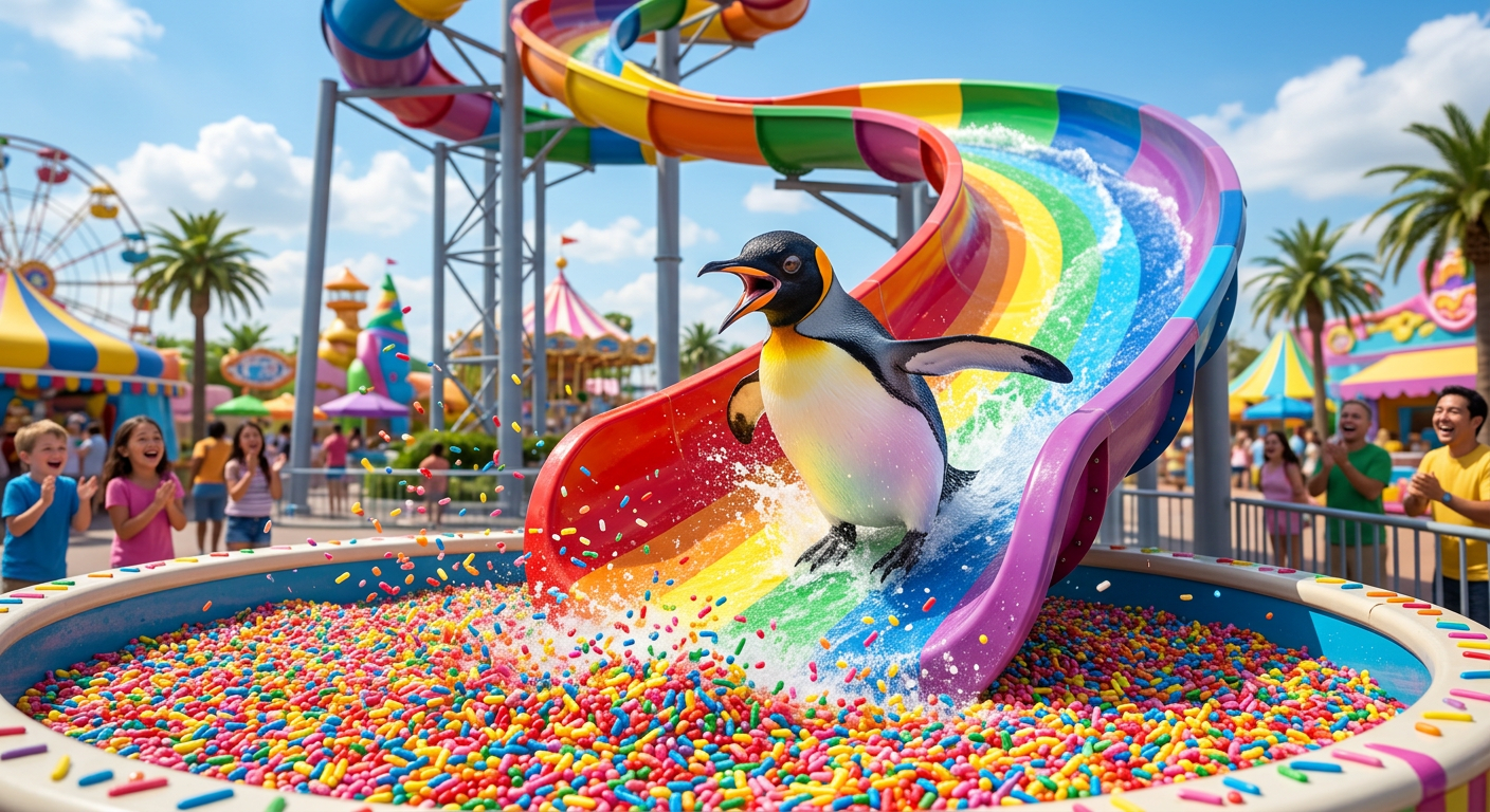 “Emperor penguin going down a giant rainbow waterslide into a pool of colorful sprinkles, pure joy”