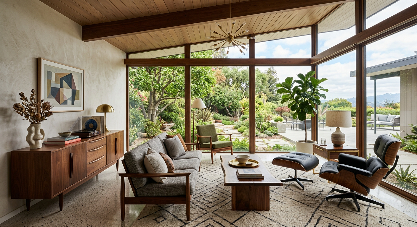 “Luxurious mid-century modern living room with Eames lounge chair, walnut credenza, floor-to-ceiling windows overlooking a garden”