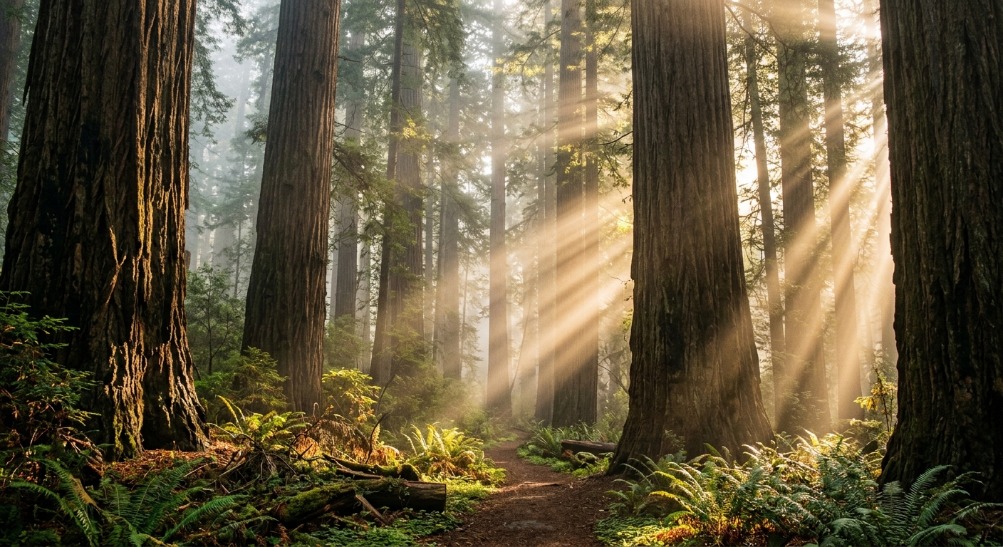 “Ancient redwood forest cathedral with golden sun rays streaming through morning mist between massive trunks”