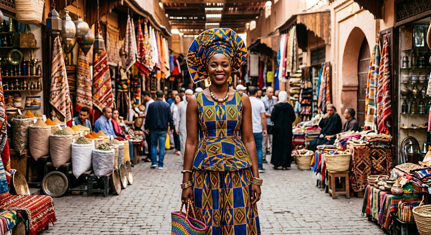 “Bold African wax print ensemble with matching geometric headwrap, vibrant Marrakech market backdrop”