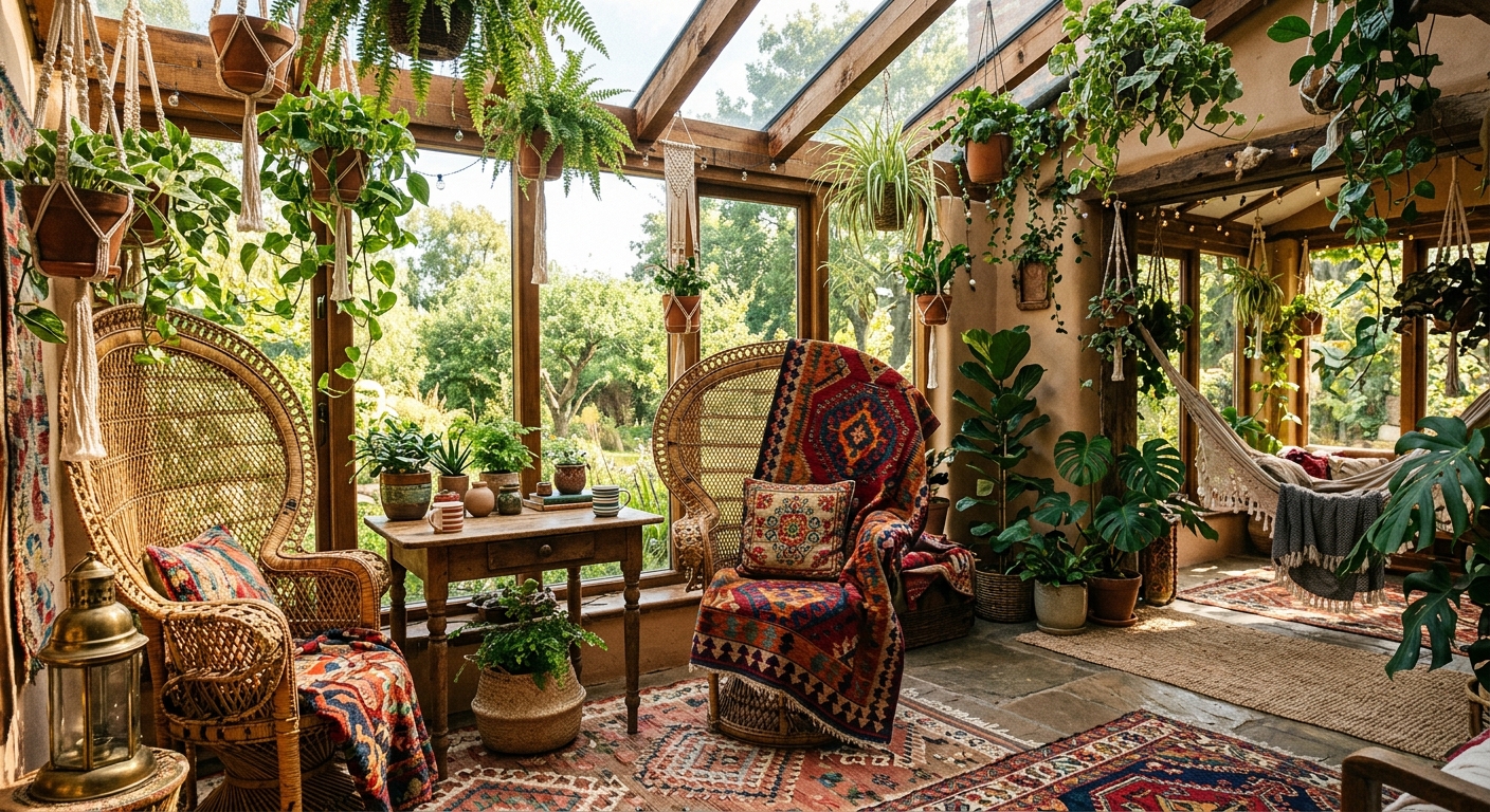 “Bohemian sunroom overflowing with hanging plants, rattan peacock chair, colorful kilim textiles”