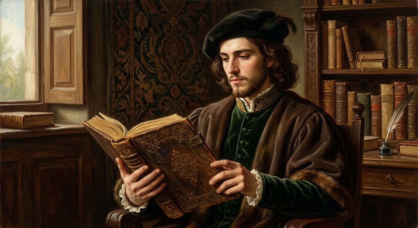 “Painterly Renaissance-style portrait of a young scholar holding an old leather-bound book”