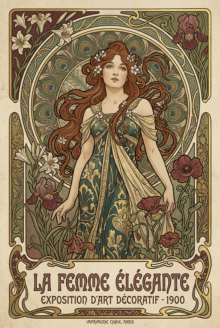 “Art nouveau poster of a woman surrounded by ornate floral borders, flowing hair, and gold leaf accents”