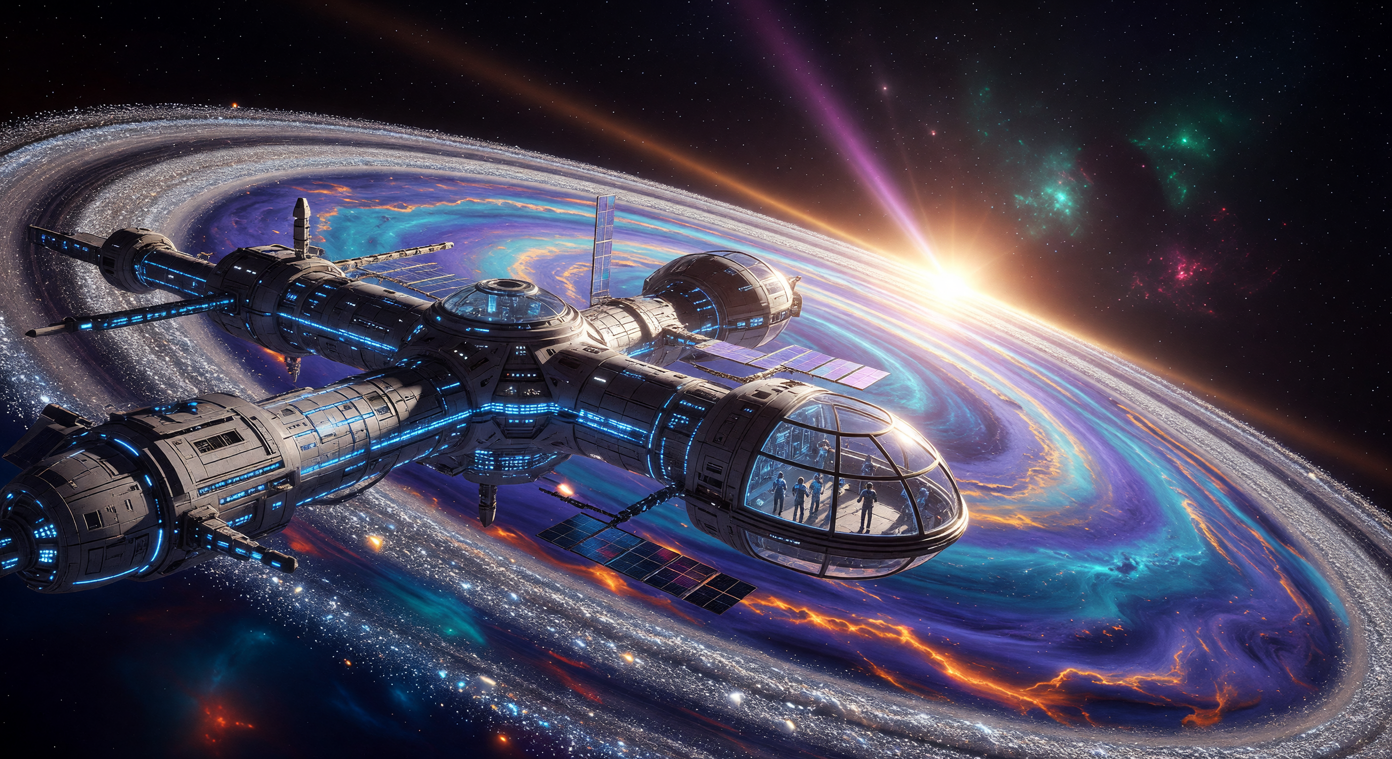 AI Photo Transformation: “A futuristic space station orbiting a ringed planet at sunrise”