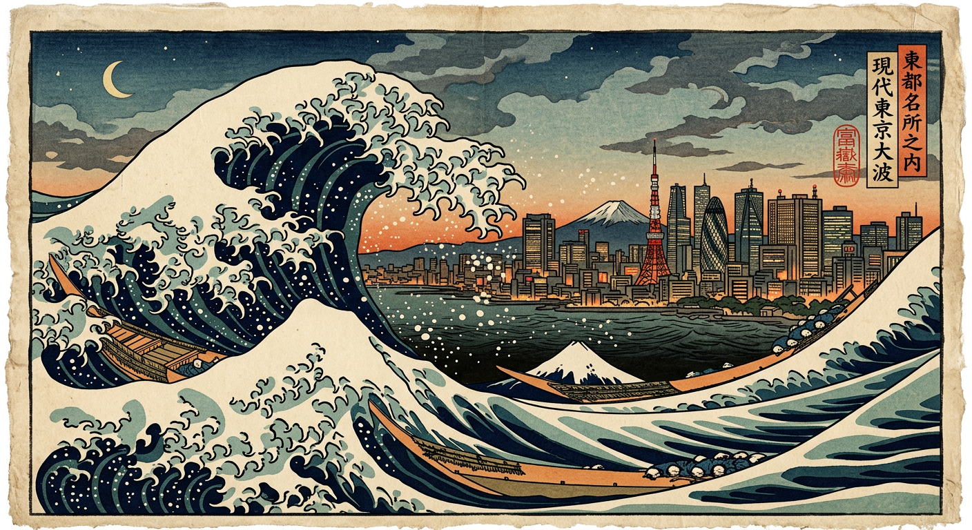 “Japanese ukiyo-e style great wave with a modern city skyline visible in the background, woodblock print texture”