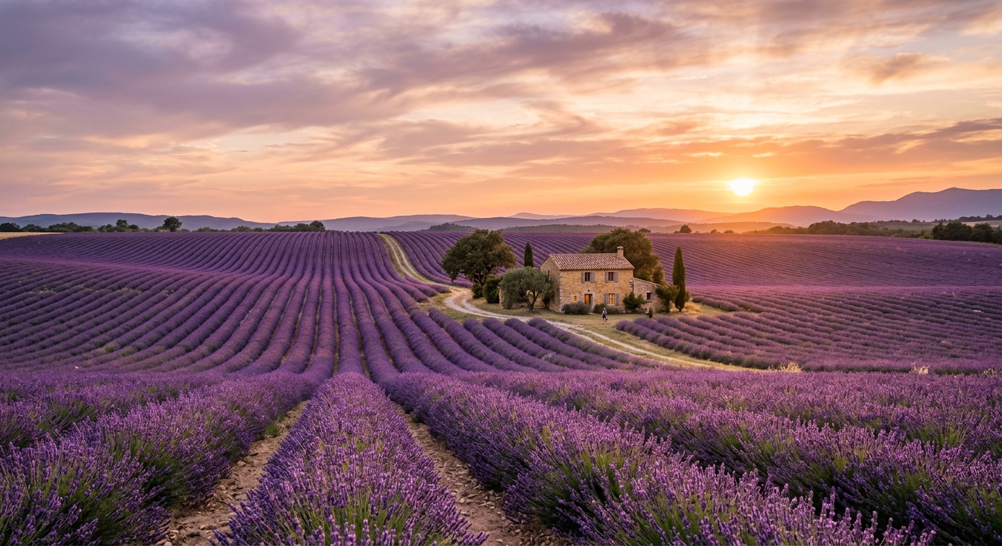 “Endless lavender fields stretching to the horizon at golden hour in Provence, a lone stone farmhouse”
