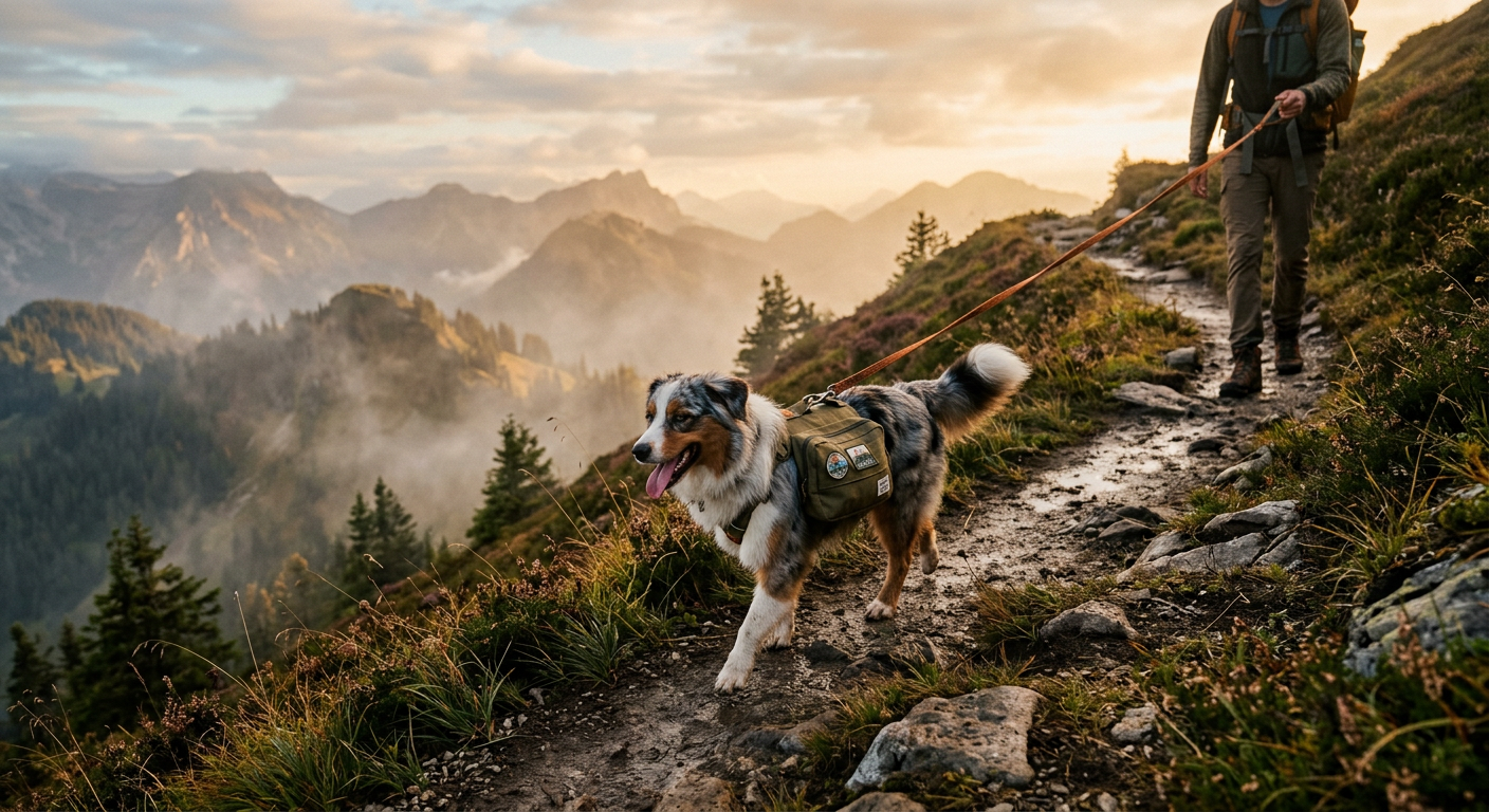 “Adventure dog with a tiny backpack hiking through misty mountain trails at golden hour”