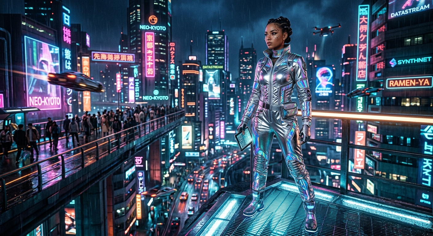 “Futuristic silver metallic jumpsuit with holographic panel details, cyberpunk neon cityscape at night”