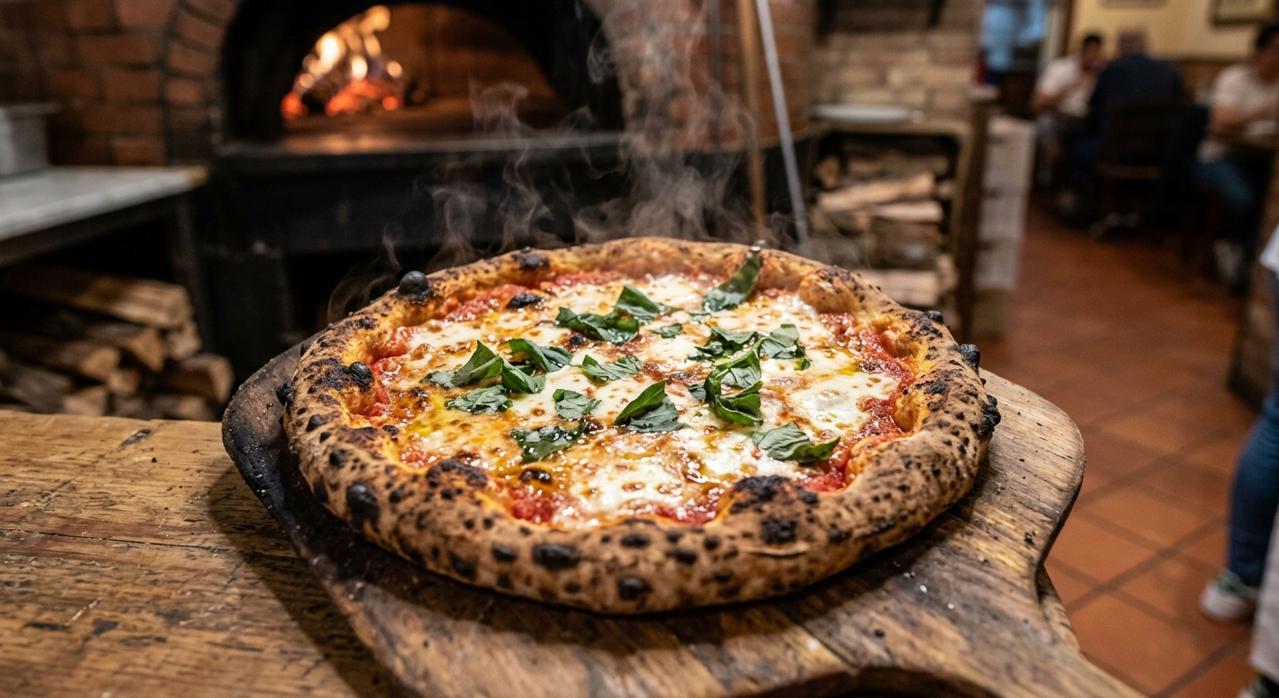 “Rustic Neapolitan pizza fresh from a wood-fired oven, bubbling mozzarella, torn basil, wisps of steam rising”