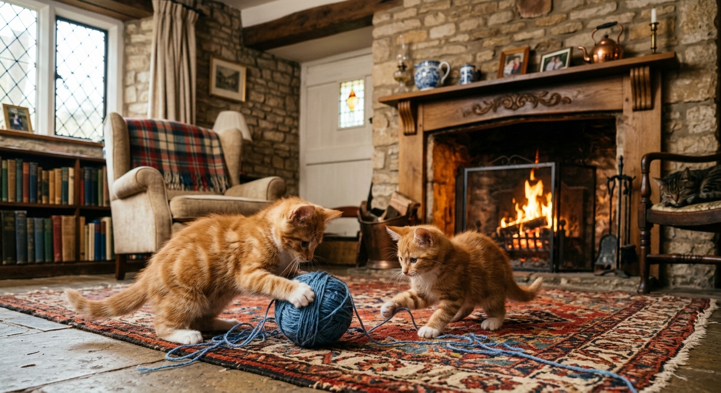 “Two ginger kittens playing with a ball of yarn in a cozy English cottage, fireplace glowing”
