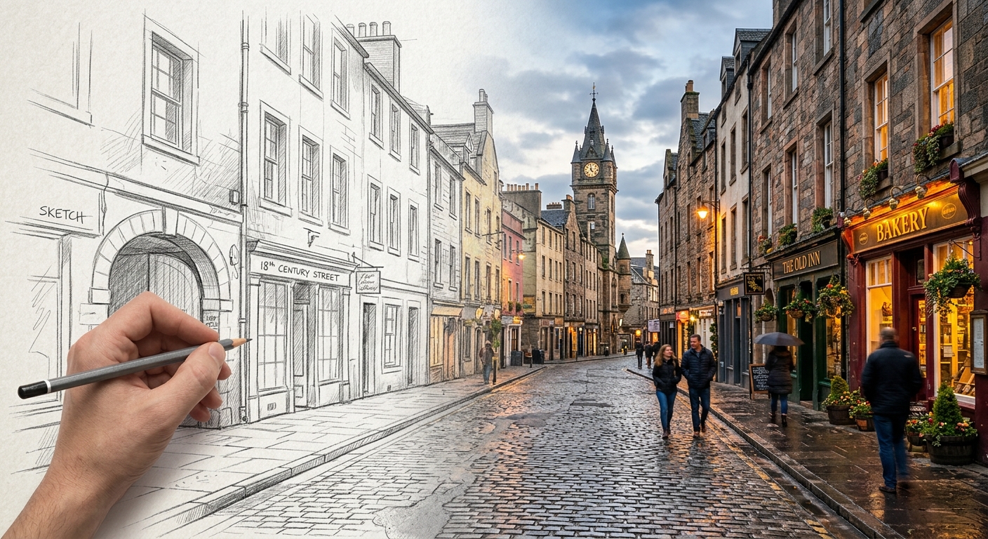 “Pencil sketch coming to life: half-drawn, half-photorealistic cobblestone city street, graphite fading to color”