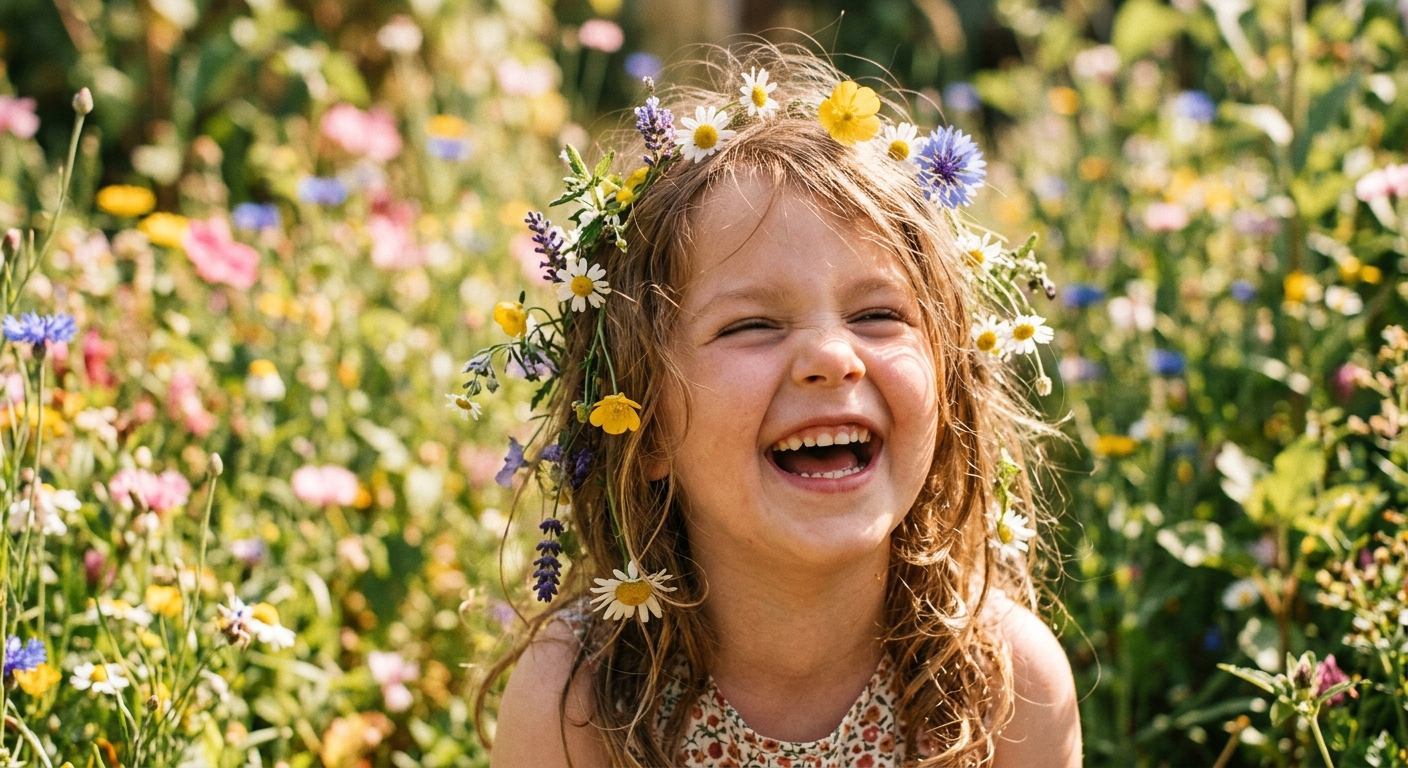 “Close-up portrait of a child laughing with wildflowers in their hair, sun-dappled garden”