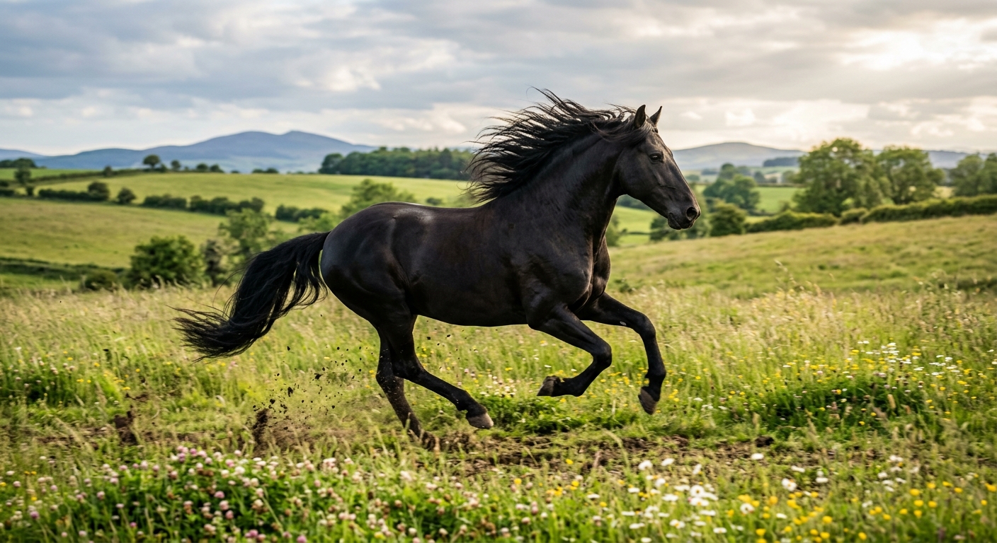 "Majestic black stallion galloping through a meadow with its mane flowing dramatically in the wind" — NanoFlash