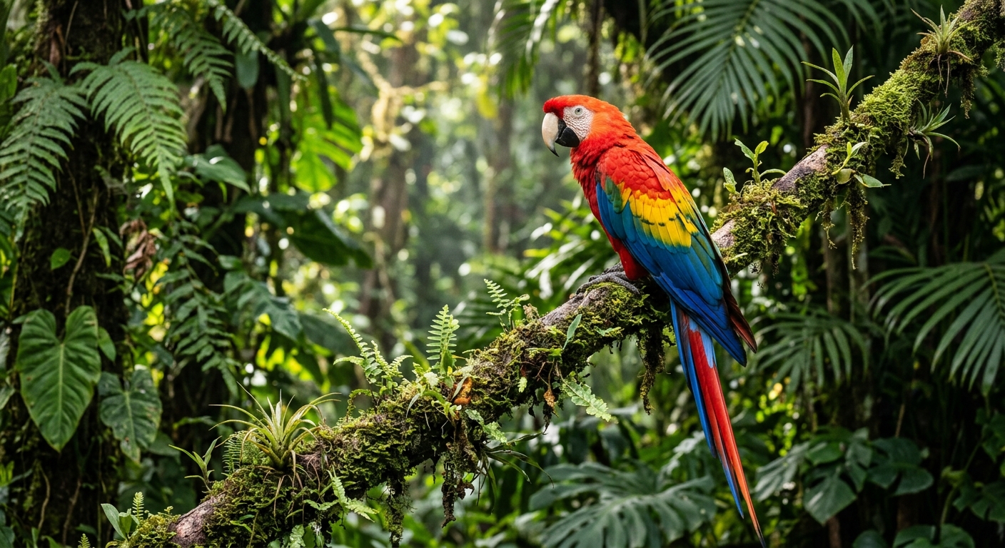 “Colorful macaw parrot perched on a mossy branch in a tropical rainforest, vibrant plumage detail”