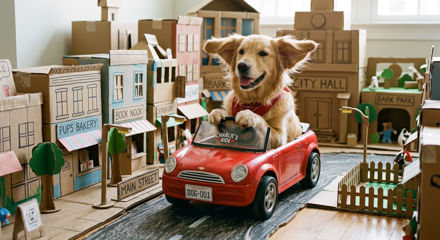 “Golden retriever driving a tiny red convertible car through a miniature cardboard city, wind in its ears”