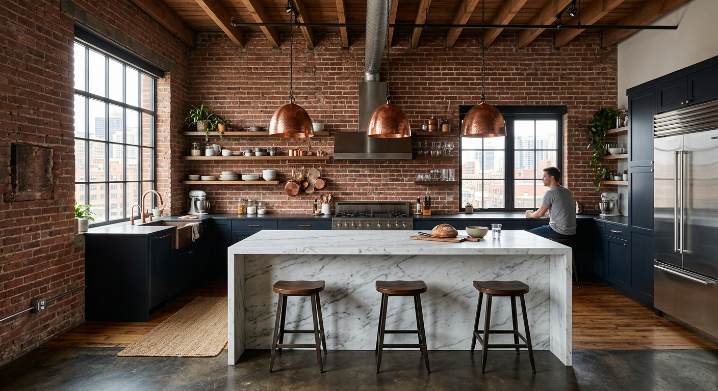 “Industrial loft kitchen with exposed brick walls, copper pendant lights, and a white marble waterfall island”