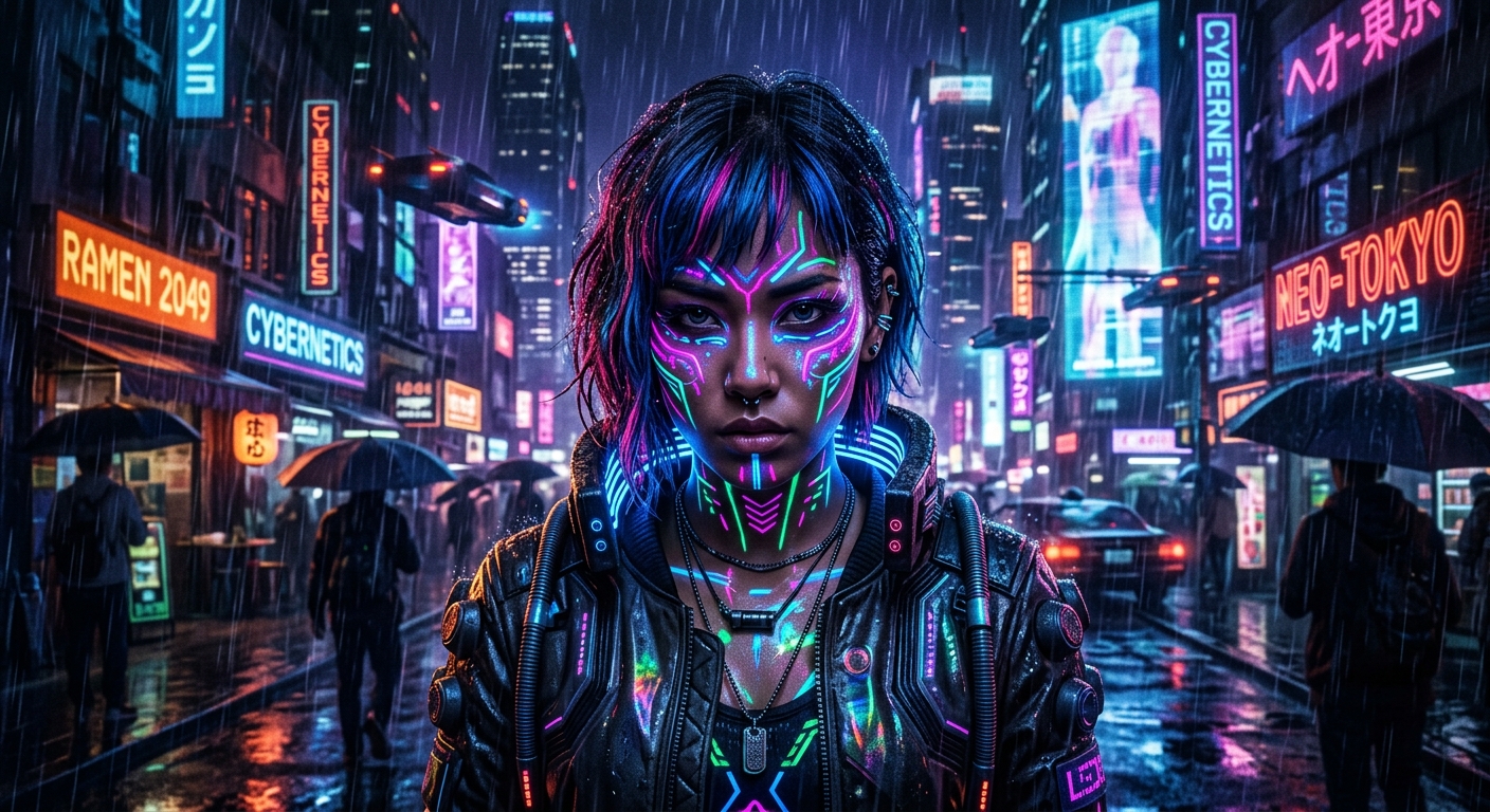 “Cyberpunk portrait with neon face paint, holographic reflections, rain-slicked city backdrop”