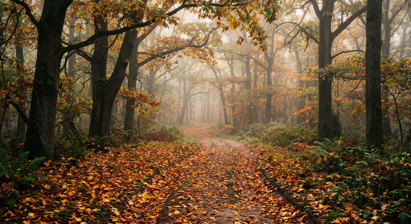 “Winding forest path blanketed in golden and crimson autumn leaves, early morning fog filtering through oaks”