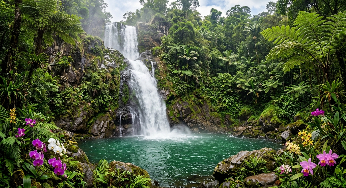 “Towering tropical waterfall cascading into an emerald pool surrounded by lush ferns and orchids”